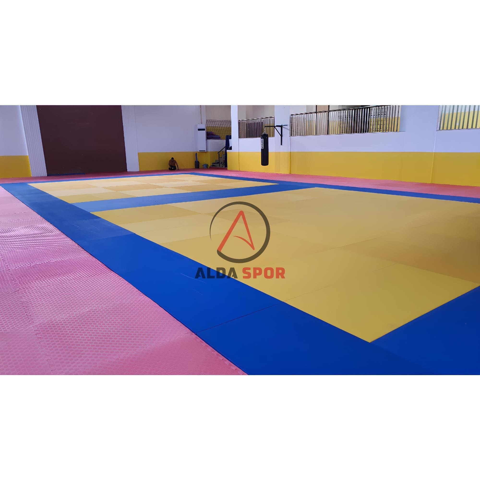 Dimensions are 100x200x4 cm. It is suitable for use in martial arts and is an IJF standard product for competition.